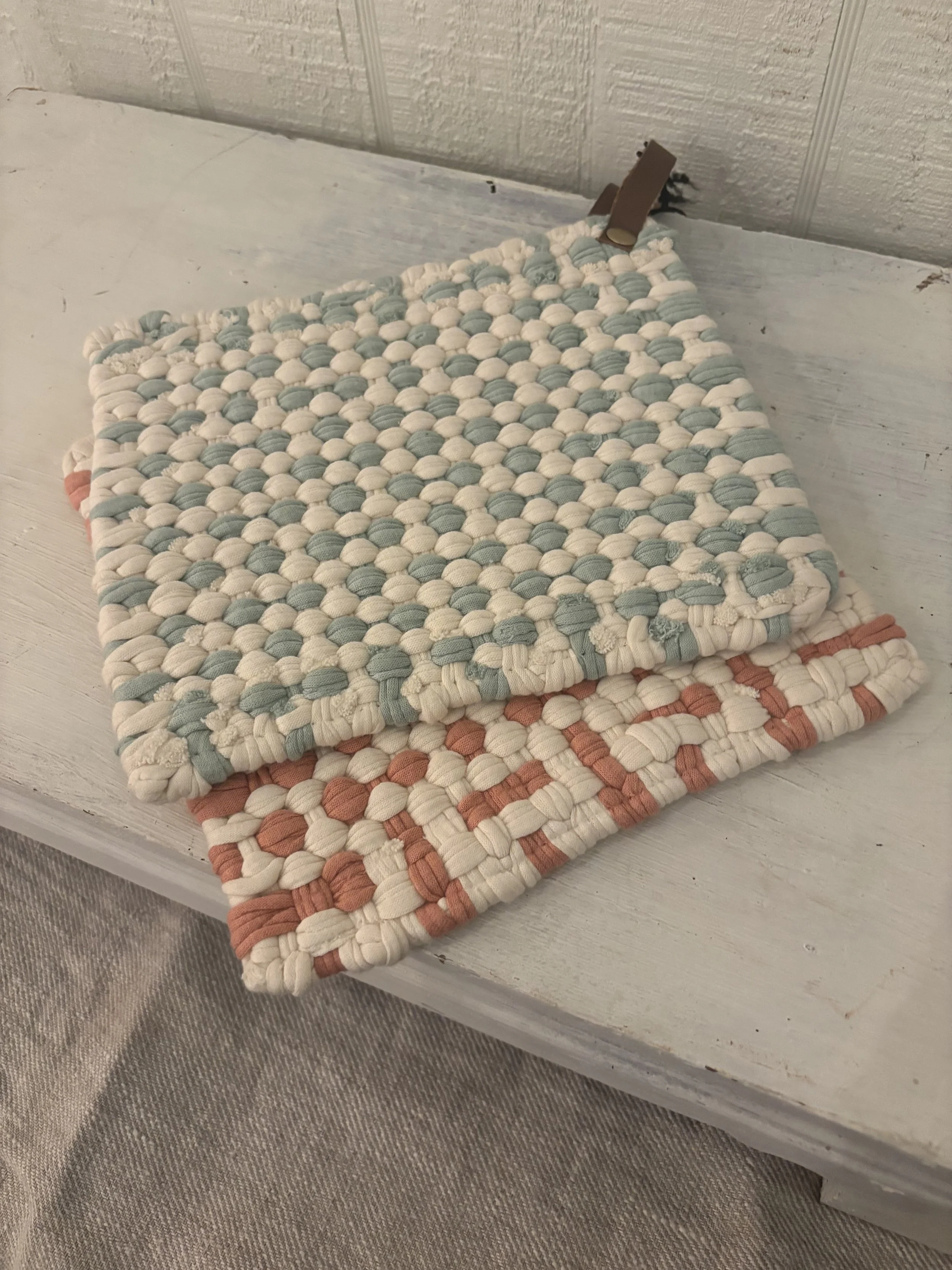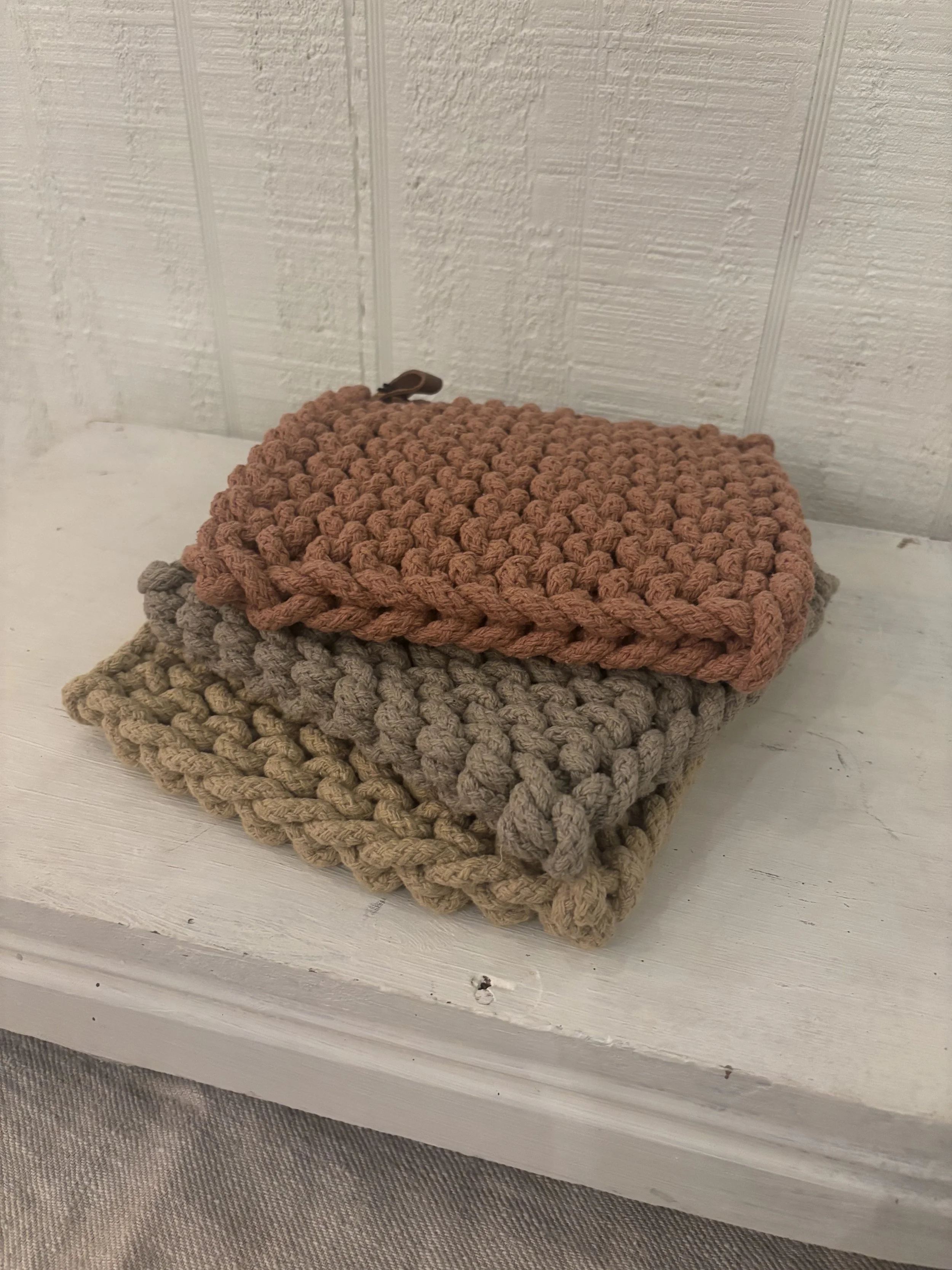 sq cotton crocheted pot holder w leather loop (requests 2) ($8.95)