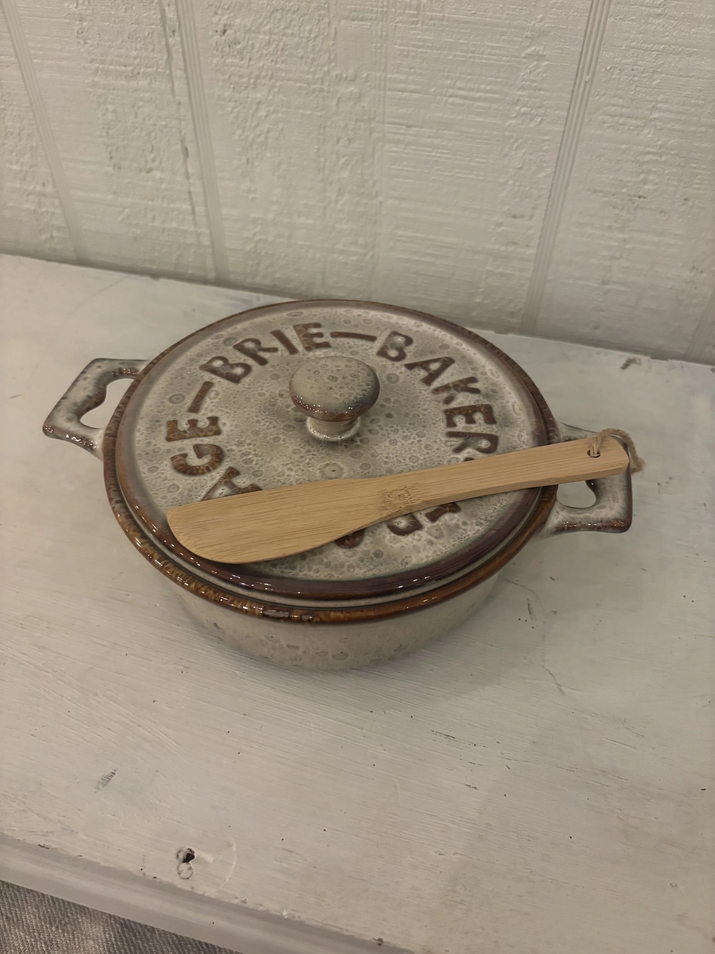 stoneware Brie baker w bamboo canape knife ($29.95)